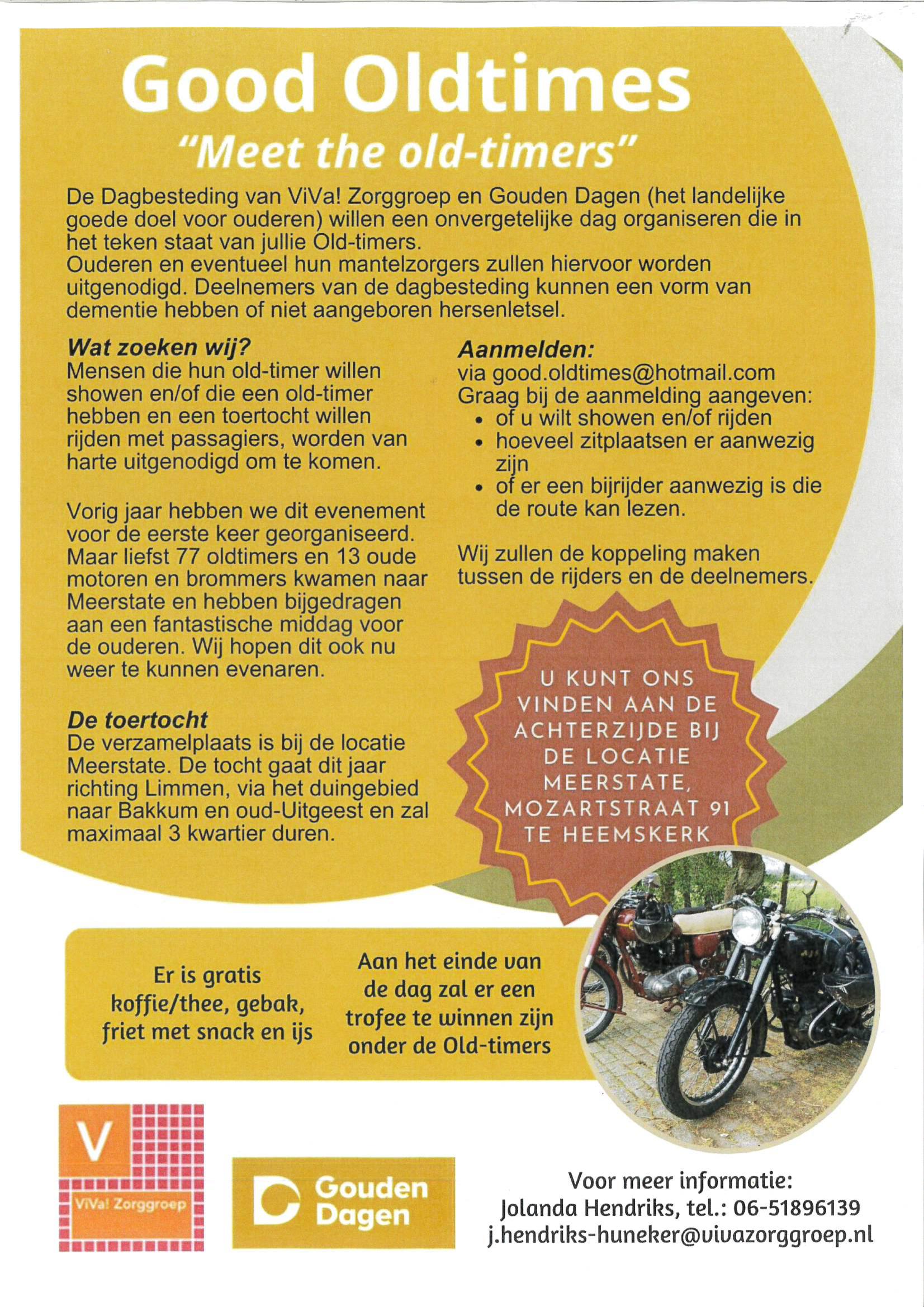 Op 26 april zal voor de tweede keer Good Oldtimes georganiseerd worden. In Heemskerk zal vanaf 13:00 uur (graag iets eerder aanwezig zijn) tot 17:00 uur voor cliënten van de Viva! Zorggroep en de bewoners van Zorgcentrum Meerstate een oldtimerbijeenkomst plaatsvinden.