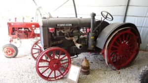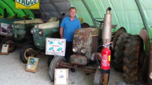 Op het erf staan een vijftal ronde plastic kweektunnels van ca. 30 meter lang. De voor en achterkant zijn gewoon open, als het ergens gelekt heeft dan droogt het ook weer snel. De tunnels staan vol met tractoren en landbouw gereedschappen. Er staan zeker meer dan 400 tractoren met bouwjaren vanaf 1910 tot ca. 1970. De eerste types hadden alleen ijzeren banden op het wiel, maar uiteraard werd er al gauw over gestapt op rubberen banden. Stoom tractoren en diesels. Er zijn kleine modellen, maar ook van die enorme machines waarmee grote landbouwmachines door de zware klei kunnen worden getrokken. Ook de tractors met hoge poten, die hoog boven wijnranken uit rijden staan er. Alles staat netjes op het gravel. (zo lekt die olie netjes weg,  niet  overal van die vieze opvangbakjes). Tussendoor staan allerlei attributen uit het boerenbedrijf. Kunstkoeien en melkbussen maar ook dorsmachines en maaimachines en ook veel  handgereedschap.