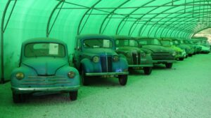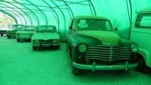 Nadat de tractoren bekeken zijn kom je bij de landbouwtunnels en loodsen vol met auto´s. Gewone dagelijks op de weg geziene modellen. Niet de dure sportmodellen. Sommigen zijn geheel gerestaureerd en die staan prachtig te glimmen. Maar ook auto’s die er zo bij staan zoals ze uit een oude opslagplaats zijn gekomen waar ze al een tiental jaren op betere tijden hebben staan te wachten. Bestel en vrachtauto’s, brommers, motoren, fietsen, garage inventaris, gereedschappen, kinderwagens, speelgoed, alles is er in ruime mate vertegenwoordigd.