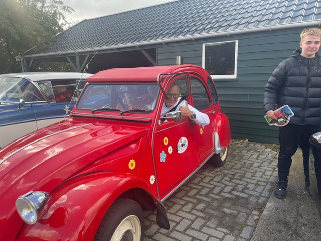 Een aantal bewoners krijgt een begeleider mee. Zij gaan meerijden in een auto met achterbank. En natuurlijk even de foto momenten bij de auto’s mogen niet ontbreken voor onze gasten
