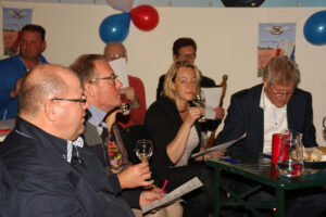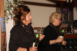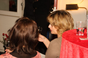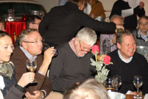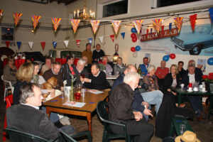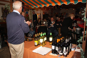 Na de uitleg over hoe je wijn het best kan proeven, welke smaak je waar proeft, uitleg over de verschillende druiven, was het tijd voor het echte werk. De dames van de evenementencommissie hadden in alle opzichten geen half werk geleverd, stemmig gekleed in het zwart met ‘shawl’ werden de glazen in rap tempo gevuld zodat iedereen tijdens het proeven het verhaal van Dick kon meekrijgen. Om na elke wijn het glas en de smaak te neutraliseren waren water en brood in ruime mate aanwezig. Met op de achtergrond chansons en musette was de zesde wijn ongemerkt een feit en kon de avond, onder het genot van de favoriete wijn, gezellig keuvelend over auto’s worden voortgezet.